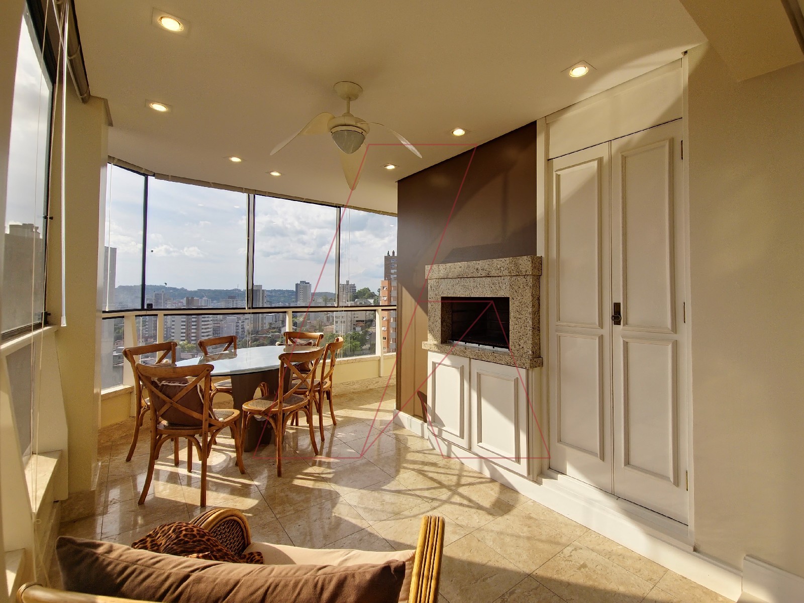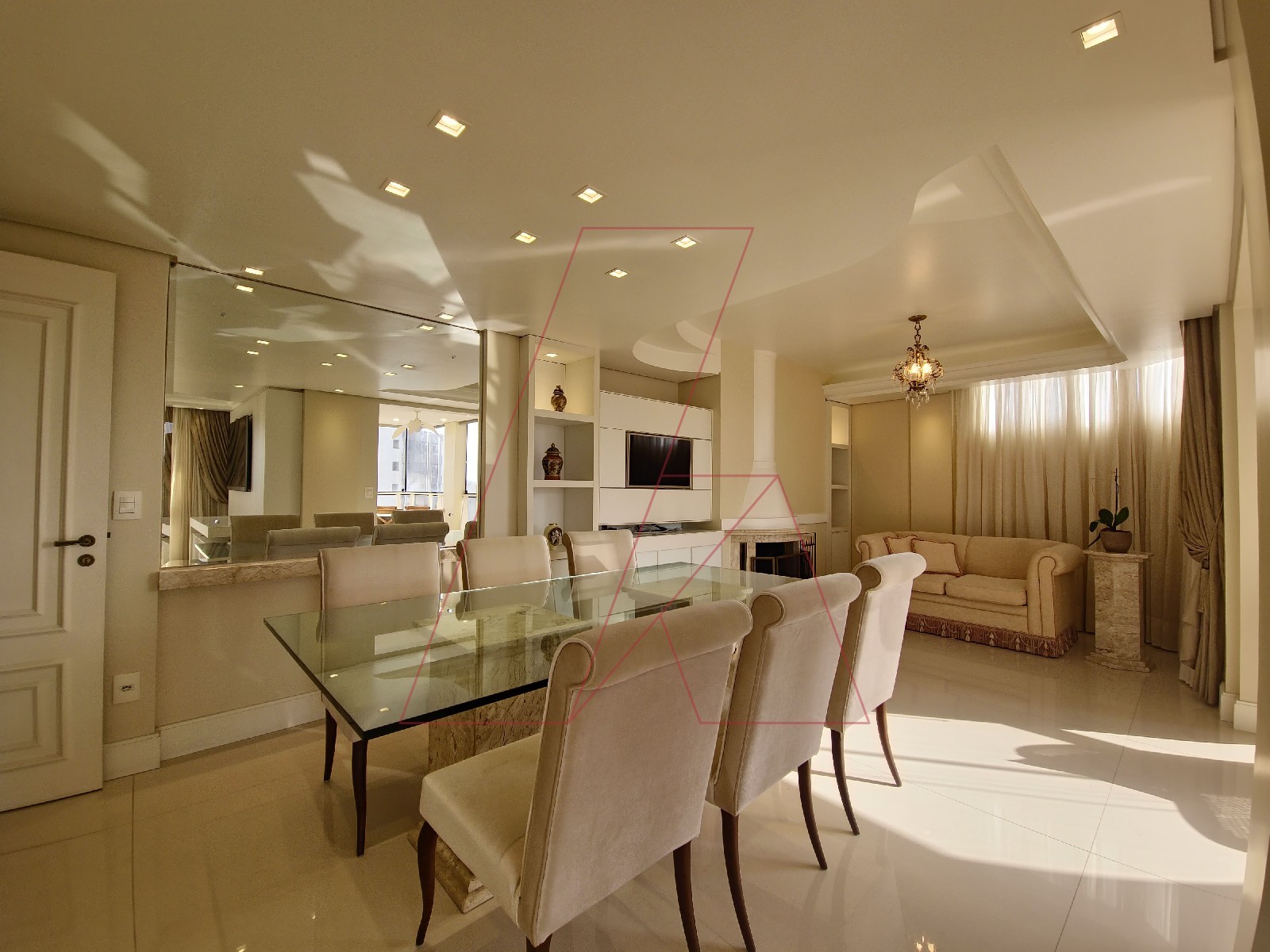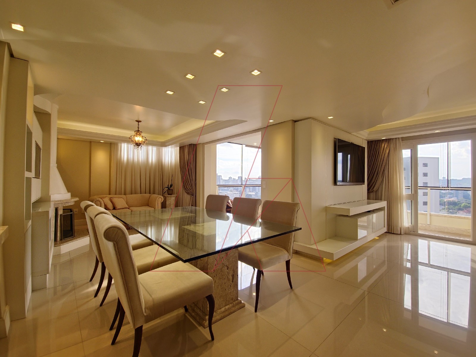 - Living integrado com sala de estar, jantar e lareira, acabamento impecável e iluminação planejada