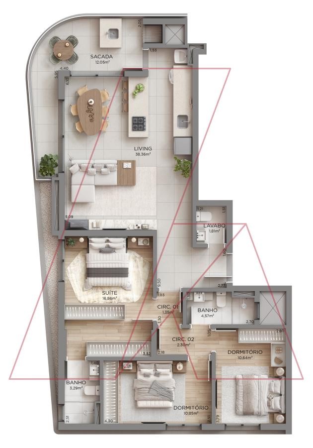 Apartamentos na planta, com 3 dormitórios, sendo 1 suíte, banheiro social, lavabo e vaga de garagem, em um projeto moderno e funcional que une conforto e elegância.